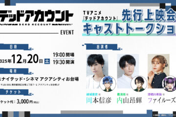 TVアニメ『デッドアカウント』先行上映会&キャストトークショーの開催が決定! 2025年11月14日 縁城蒼吏役 岡本信彦さん、霞流括役 内山昂輝さん、漆栖川希詠役 ファイルーズあいさんが登壇! 先行上映会&キャストトークショーの開催が決定! 2026年1月 より放送を開始するTVアニメ『デッドアカウント』の先行上映会の開催が決定! 本イベン... 続きはコチラ2026年冬アニバースイベント情報デッドアカウントニュース