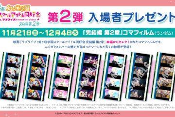 映画『ラブライブ!虹ヶ咲学園スクールアイドル同好会 完結編 第2章』第2弾入場者プレゼント『完結編 第2章』コマフィルムが解禁!12月6日(土)ミア・テイラー誕生日記念上映会の開催が決定! 2025年11月18日 TVアニメ1期・2期から続くOVA『ラブライブ!虹ヶ咲学園スクールアイドル同好会 NEXT SKY』のその後を全3部作で描く完全新作アニメーション。2025年11月7日(金)より公開された映画『ラブライブ!虹ヶ咲学園スクールアイドル同好会 完結編 第2章』。 今回、... 続きはコチラアニバースイベント情報ニュースラブライブ!ラブライブ!虹ヶ咲学園スクールアイドル同好会映画音楽