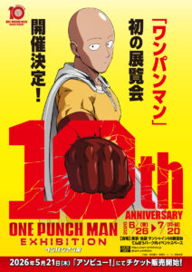 アニメ『ワンパンマン』10周年を記念して、作品初の展覧会『アニメ10周年記念「ワンパンマン展」』が、2026年6月26日(金)~7月20日(月・祝)に東京・池袋のサンシャイン60展望台 てんぼうパーク イベントスペースにて開催!本日はキャラクターデザインの久保田誓描き下ろしの本展覧会ティザービジュアルを解禁!サイタマの力強い拳が「10th」の文字を突き破る印象的なビジュアルとなっている。