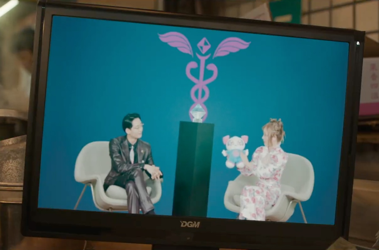 白石晴香は本編冒頭で令子(吉岡里帆)の部屋のテレビから流れる、蛇沼みゆき(竜星 涼)が経営する”蛇沼製薬”が開発した”ジェネリックテラ”を紹介する番組内で登場するアナウンサー役で出演。”ジェネテラちゃん”人形を手に、蛇沼製薬のPRを行っている。