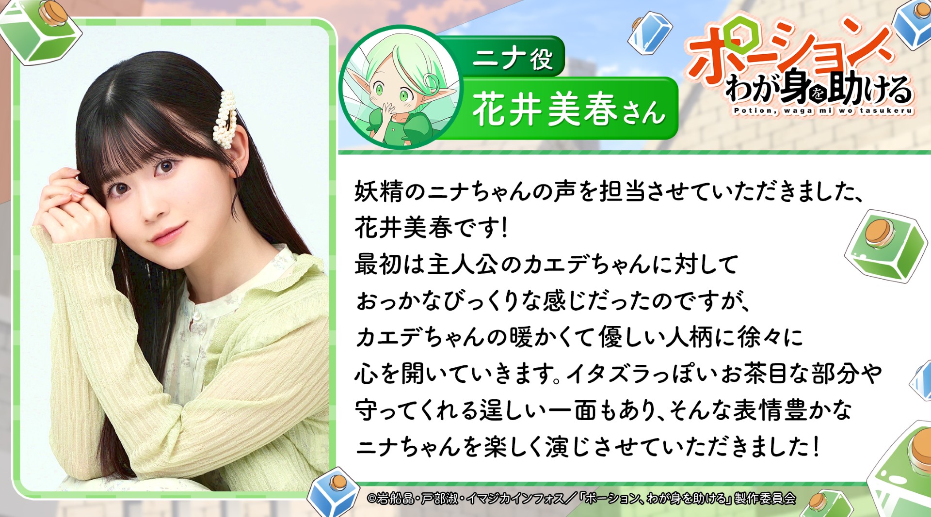 妖精のニナ役を演じるのは、『キミとアイドルプリキュア♪』キュアキッス/メロロン役、『ばっどがーる』瑠璃葉るら役、『うたごえはミルフィーユ』宮崎閏役などを担当する花井美春さん。
