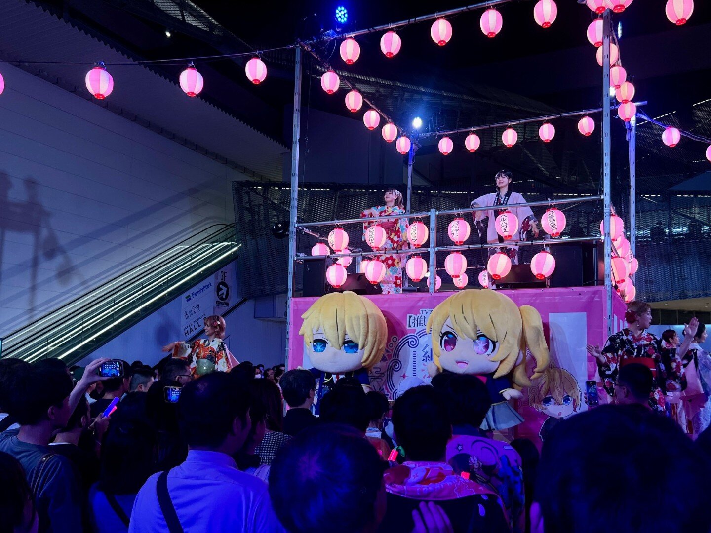 『【推しの子】』仕様の特製やぐらが立ち上がる中央広場は、夏の気配感じる陽気にぴったりといえる盆踊り広場に様変わり。『【推しの子】』の楽曲に合わせて盆踊りが楽しめる「盆踊りタイム」が計3回実施された。やぐらにはアイ、さらに関東地方初お披露目のアクア・ルビーの着ぐるみだけでなく、苺プロダクション所属のYoutuberとして知られるぴえヨンも登場。その姿に会場は大きな盛り上がりを見せていた。また当日ステージ内で発表になったが、1回目の盆踊りでは有馬かな役の潘めぐみ、黒川あかね役の石見舞菜香、MEMちょ役の大久保瑠美が。