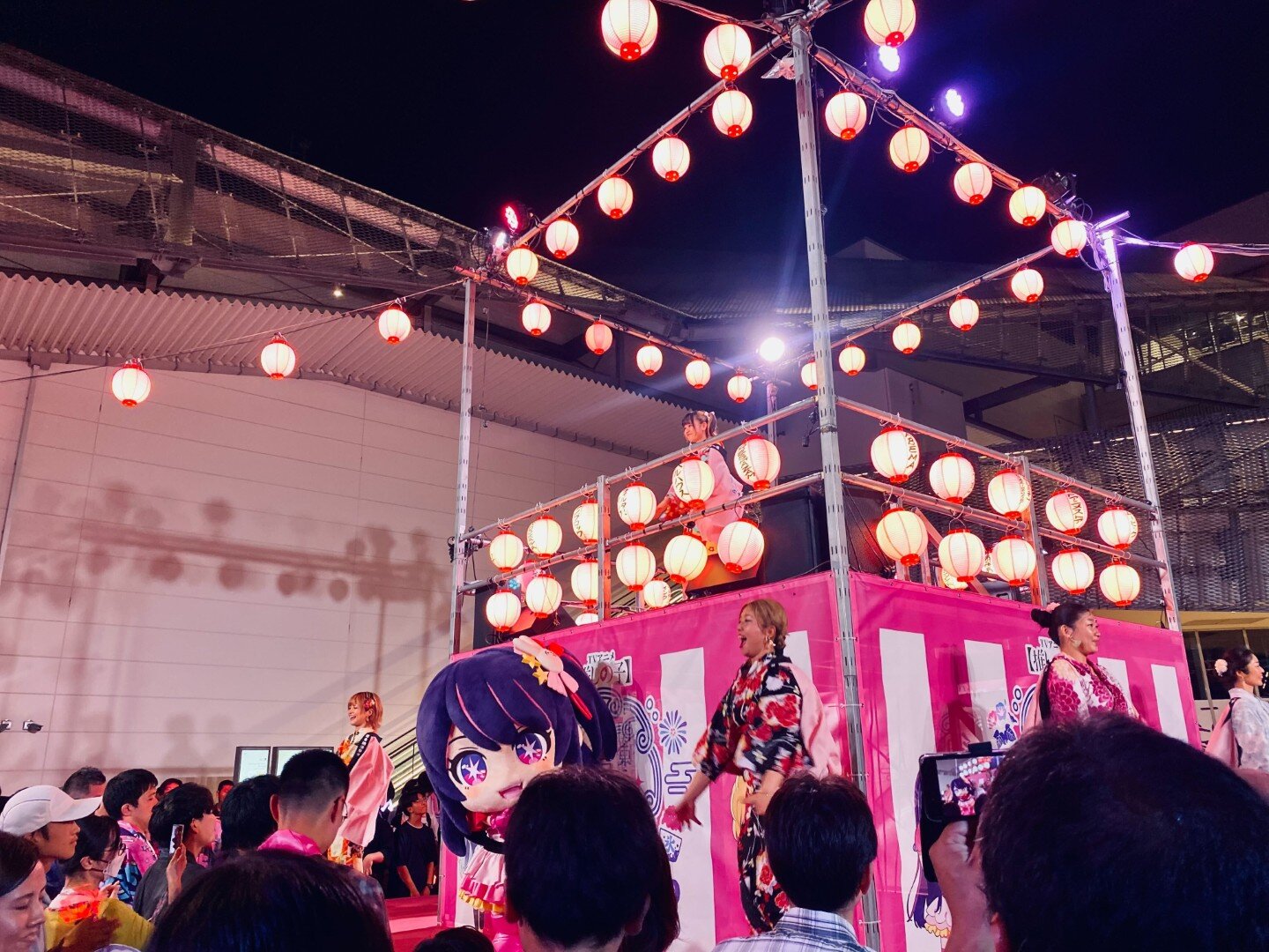 その後の2回目ではアクア役の大塚剛央、ルビー役の伊駒ゆりえも会場を盛り上げるべく、盆踊り広場に登場。そして最後の3回目の盆踊りタイミングには5人全員が満を持して集結し参加者とともに盆踊りを楽しむ姿は、公式イベントならではの光景だった。
