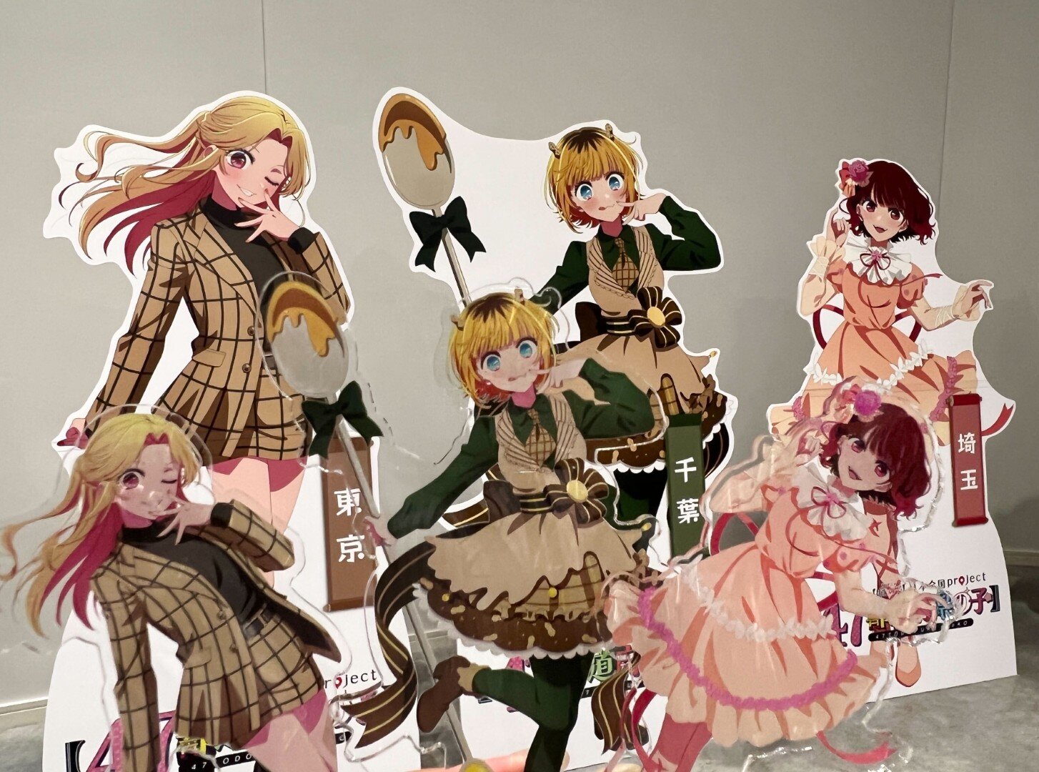 ところざわサクラタウン内角川武蔵野ミュージアム三階展示室では、作品関連の展示物の数々に来場者が足を止めていた。まず来場者を出迎えるのは壁面いっぱいに貼りだされた「POP IN 2」・「東京ブレイド」のイラスト。さらに進むと、全47都道府県ごとにすべて描きおろされた「47都道府県ビジュアル」が展示されていた。各都道府県の名所を背景にしたパネルだけでなく、等身大のビジュアルパネルも勢ぞろい。じっくり見入る方、推しのキャラクターとともに写真を撮る方など、思い思いの楽しみ方をしている姿が印象的だった。