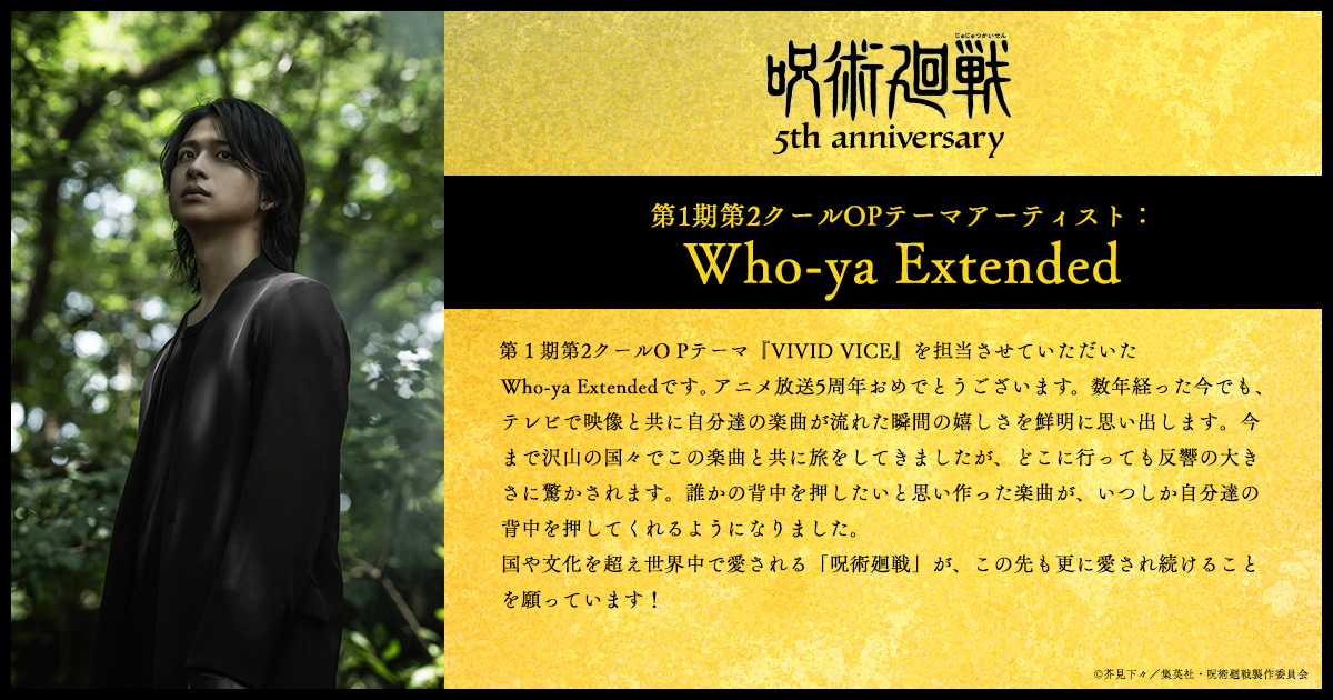 第1期第2クールO Pテーマ『VIVID VICE』を担当させていただいたWho-ya Extendedです。アニメ放送5周年おめでとうございます。数年経った今でも、テレビで映像と共に自分達の楽曲が流れた瞬間の嬉しさを鮮明に思い出します。今まで沢山の国々でこの楽曲と共に旅をしてきましたが、どこに行っても反響の大きさに驚かされます。誰かの背中を押したいと思い作った楽曲が、いつしか自分達の背中を押してくれるようになりました。