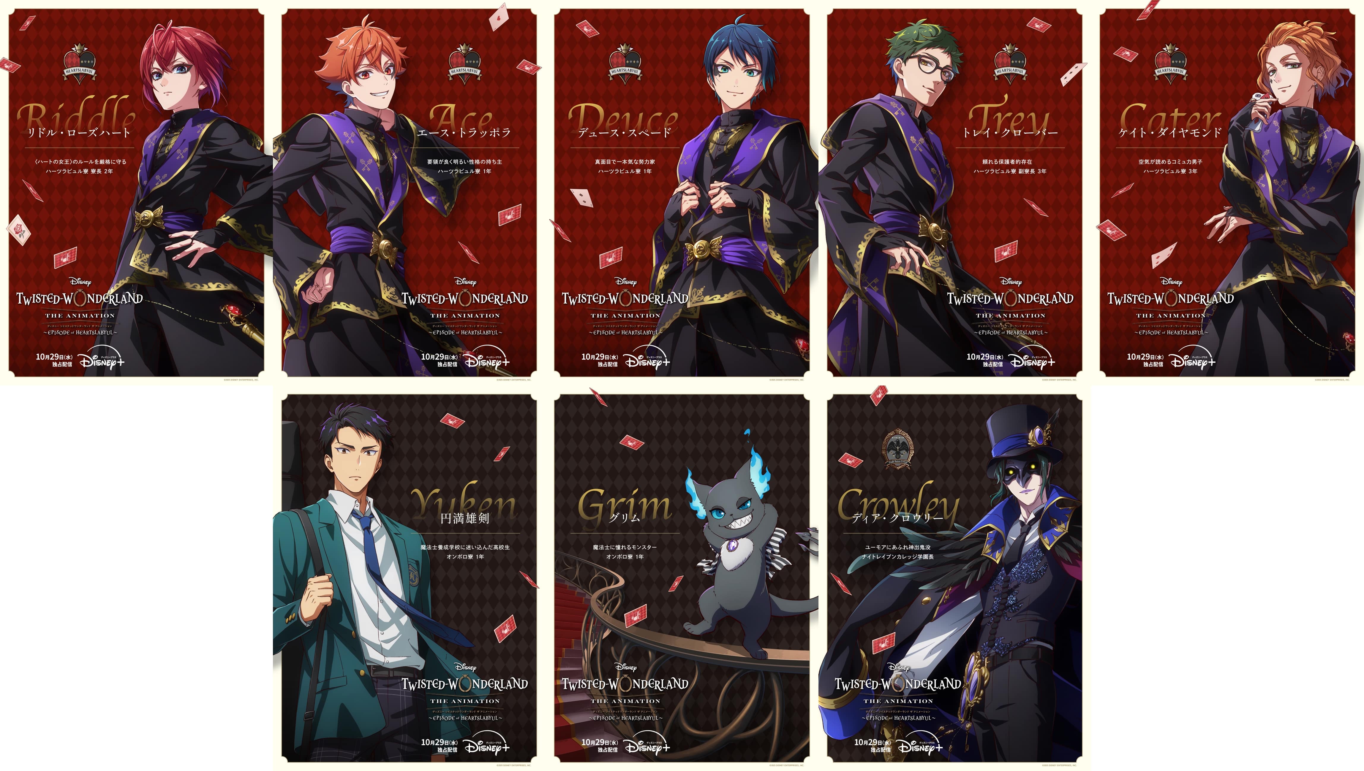 今回解禁されたのは『ディズニー ツイステッドワンダーランド ザ アニメーション』シーズン1「エピソード オブ ハーツラビュル」で物語の中心となる8名が描かれたキャラクターポスター。エース、デュース、雄剣、クロウリーは新たに描き下ろしされた初公開のアートを使用。さらに、各ボイスキャストが演じたキャラクターについて語るコメントも解禁となった。