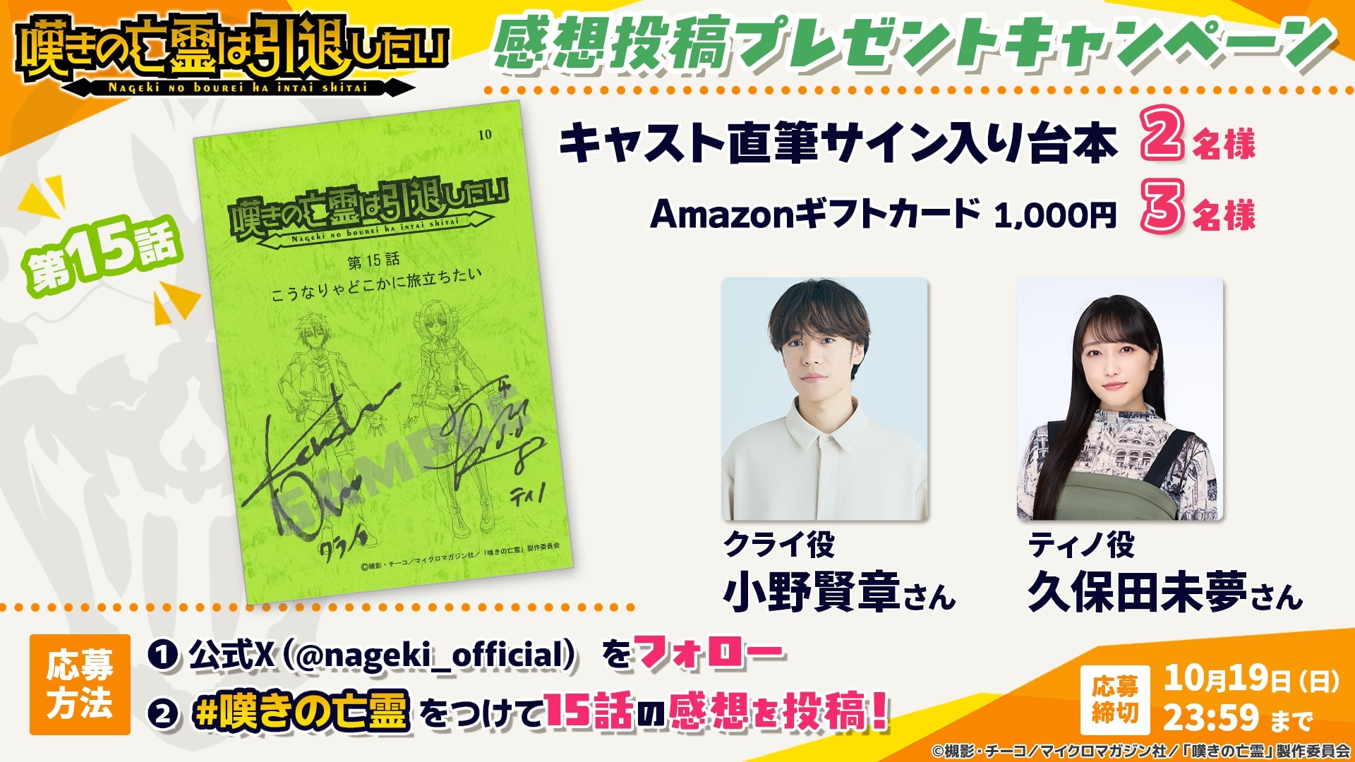 第15話の放送を記念して、小野賢章さん(クライ・アンドリヒ役)、久保田未夢さん(ティノ・シェイド役)の直筆サイン入り台本やAmazonギフトカード1,000円分が当たるキャンペーンを開催します。