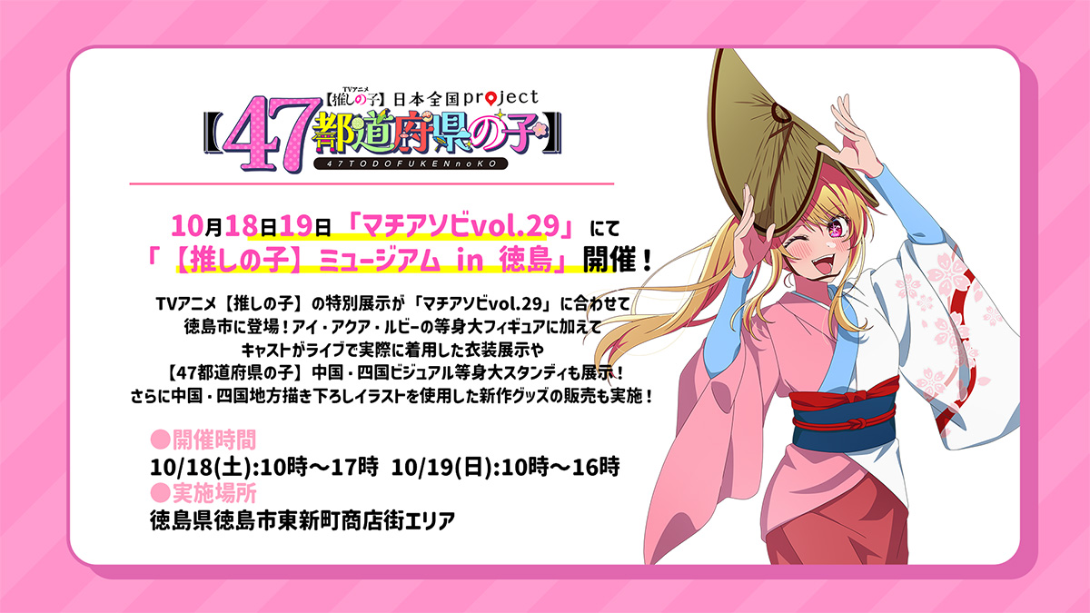 今週末の10月18日(土)・19日(日)に徳島県徳島市・JR徳島駅一帯で開催される徳島から広がる進化型アニメイベント“マチ★アソビvol.29” にTVアニメ【推しの子】の出展が決定!