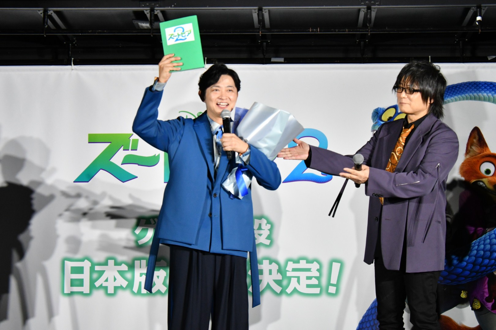 一方の下野は「私はオーディションしか受けていないから、まだ(作品について)知らないんですよ(笑)」と前置きしつつ、自身の役に絡めて「ゲイリーは指名手配犯ですけど、見る限りそんなに悪質な感じはしないかなと」と考察。自身との共通点についても触れながら「よく見るとゲイリーは、牙が片方だけ出ているんですけど、僕も八重歯があるんですよ!だから(自分と)同じかもしれないなという予想をしています(笑)」と嬉しそうに語ると、森川も「そっくりに見えてきた!(笑)」と笑顔で同調した。ジュディとニックの物語に、下野演じる新キャラクター・ゲイリーが加わることで、一体どんなシナジーが生まれるのか?!そして、彼らが行きつくズートピアの巨大な謎とは?最後に、下野演じるゲイリーの仲間入りを祝福し、森川がヘビのゲイリーをイメージした花束と台本を贈呈。「ようこそズートピアへ!!頑張ってゲイリーを演じてください!」と激励を贈られた下野は、「今から勝手に緊張しています。頑張ります!」とほほ笑んだ。