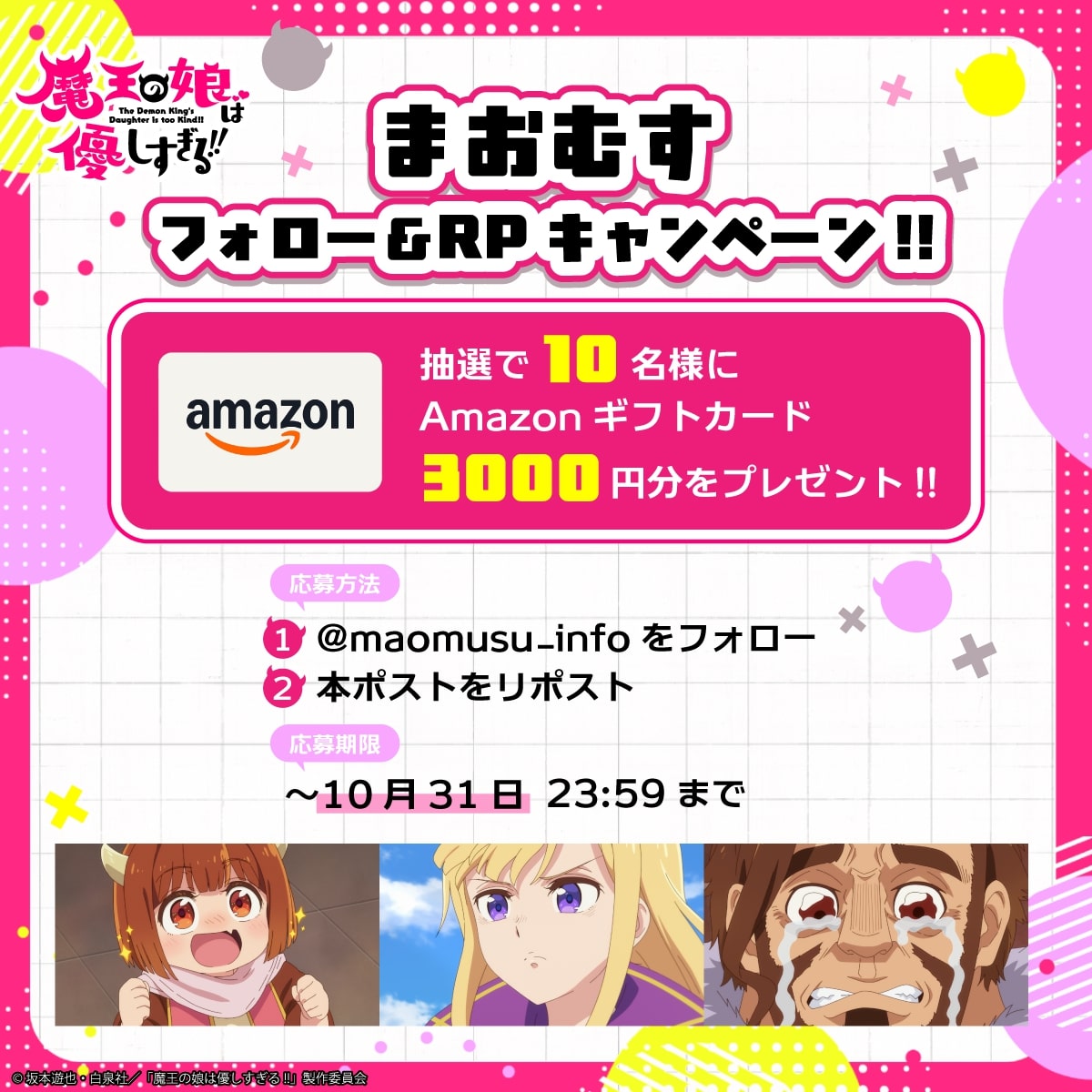 「魔王の娘は優しすぎる!!」公式Xにて、フォローおよび対象ポストのリポストを行った方の中から、抽選で「Amazonギフトカード」3,000円分を10名さまにプレゼント!