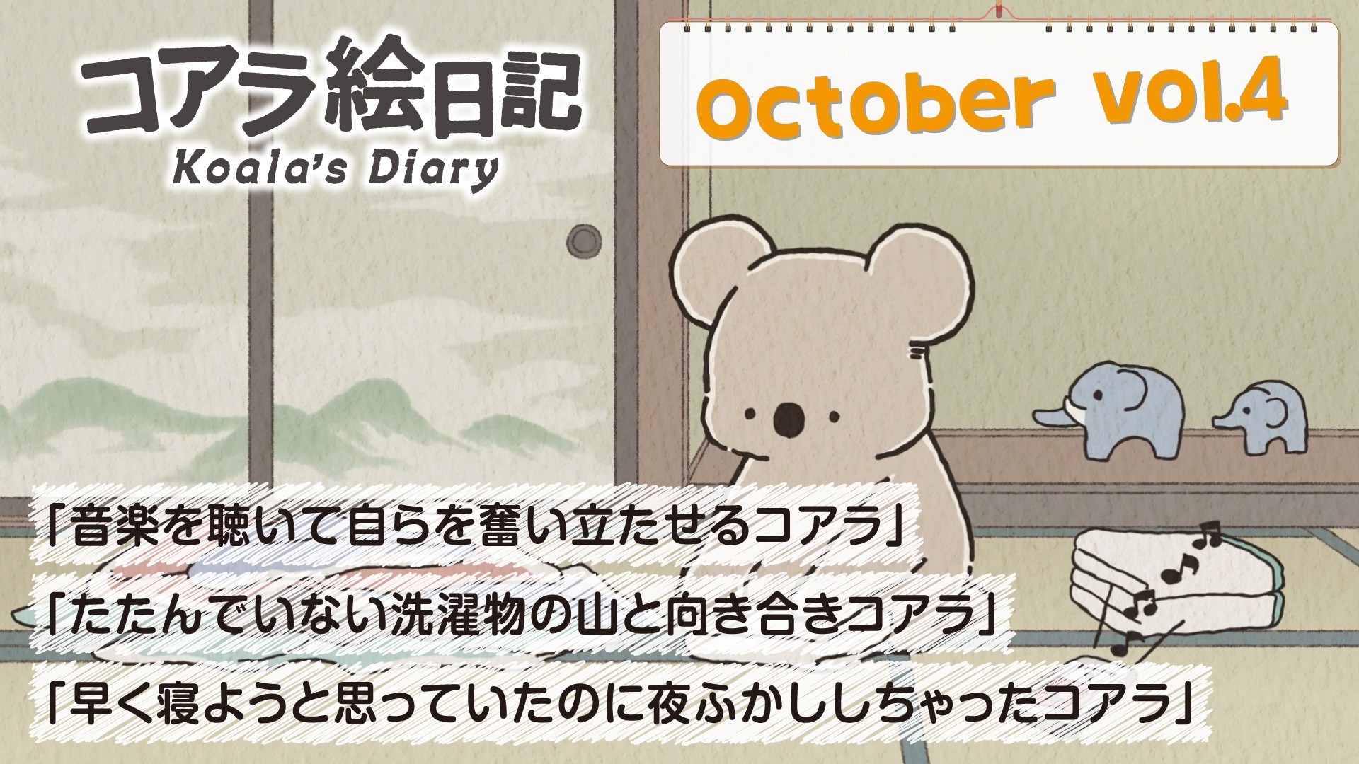 10月vol.4「音楽を聴いて自らを奮い立たせるコアラ」「たたんでいない洗濯物の山と向き合うコアラ」「早く寝ようと思っていたのに夜ふかししちゃったコアラ」
