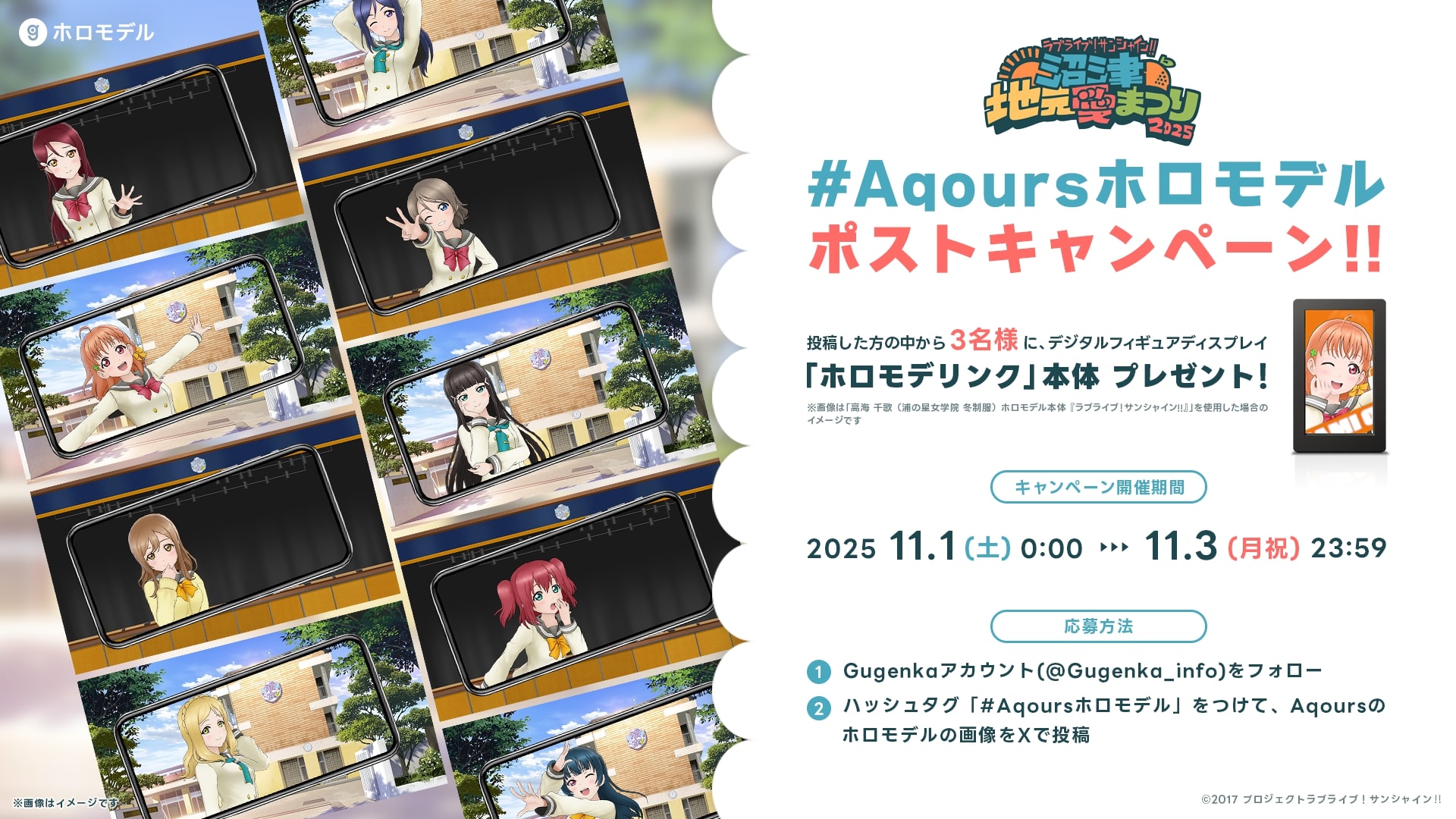 2025/11/1(土)~11/3(月・祝)の期間中に、Xで「ラブライブ!サンシャイン!!」のホロモデルを使用した画像を、ハッシュタグ「#Aqoursホロモデル」をつけてポストした方から3名様に、ホロモデルを飾れるディスプレイ「ホロモデリンク」がプレゼントされる。