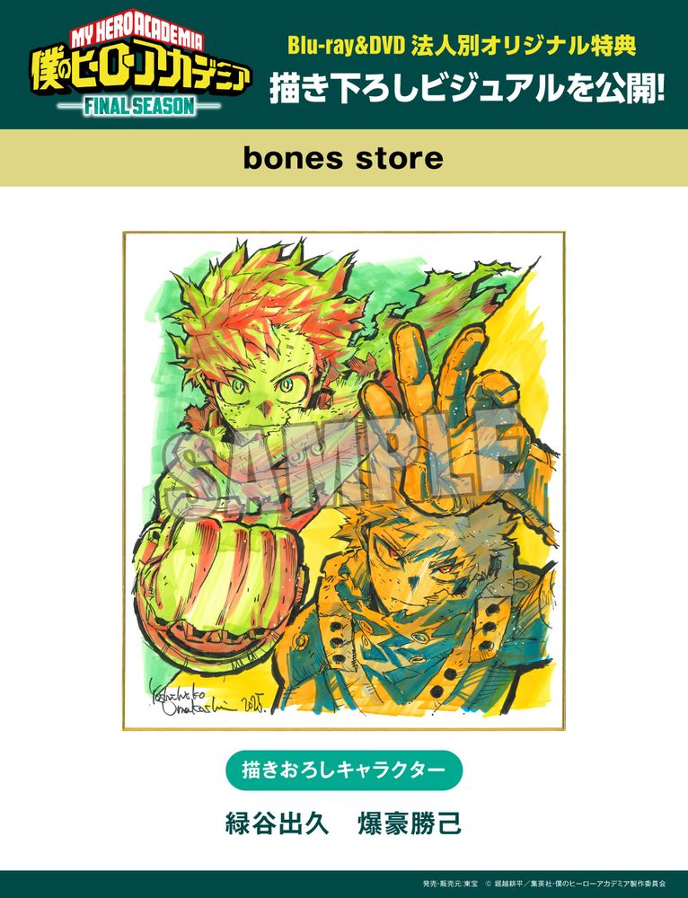 さらに通販サイトbones storeは馬越嘉彦氏の描き下ろしによる、力強くポーズをとるデクと爆豪!それぞれがファンにはたまらない必見のビジュアルで、それぞれの特典にデザインされる形となる。