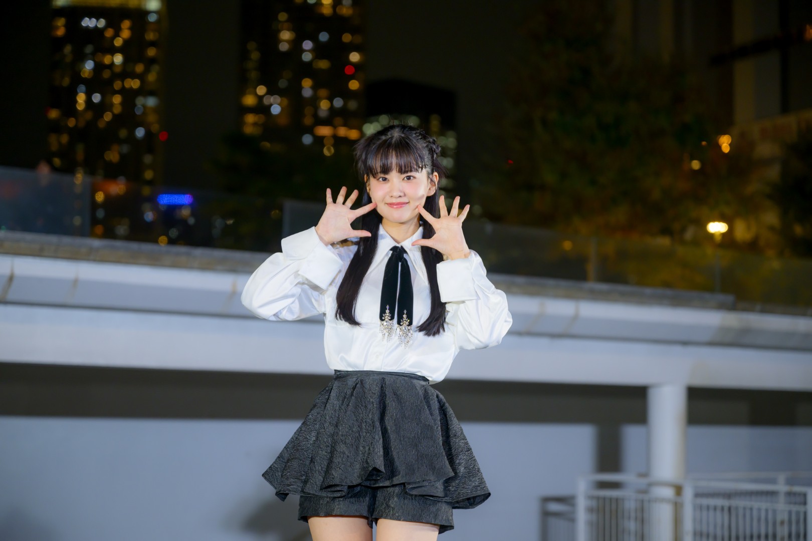 陽が沈み、辺りも暗くなった17時半。大西亜玖璃がステージに立つと、いつもより控えめな声援が送られる。というのも会場にデシベル制限があったからなのだが、彼女の普段のライブは、ファンの声がかなり大きいので、この日は、全体的に声のボリュームを抑えてのステージとなった。