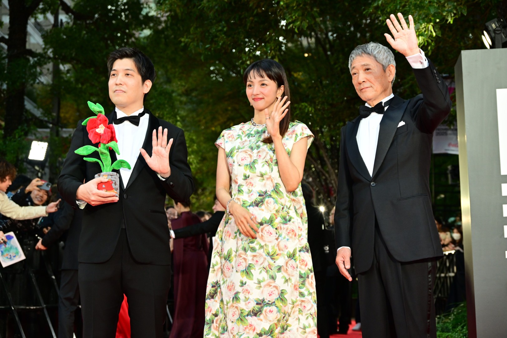 ⼩林と⽊下監督はタキシードに⾝を包み、満島は⽩地にピンクの花柄をあしらったロングドレスで登場。