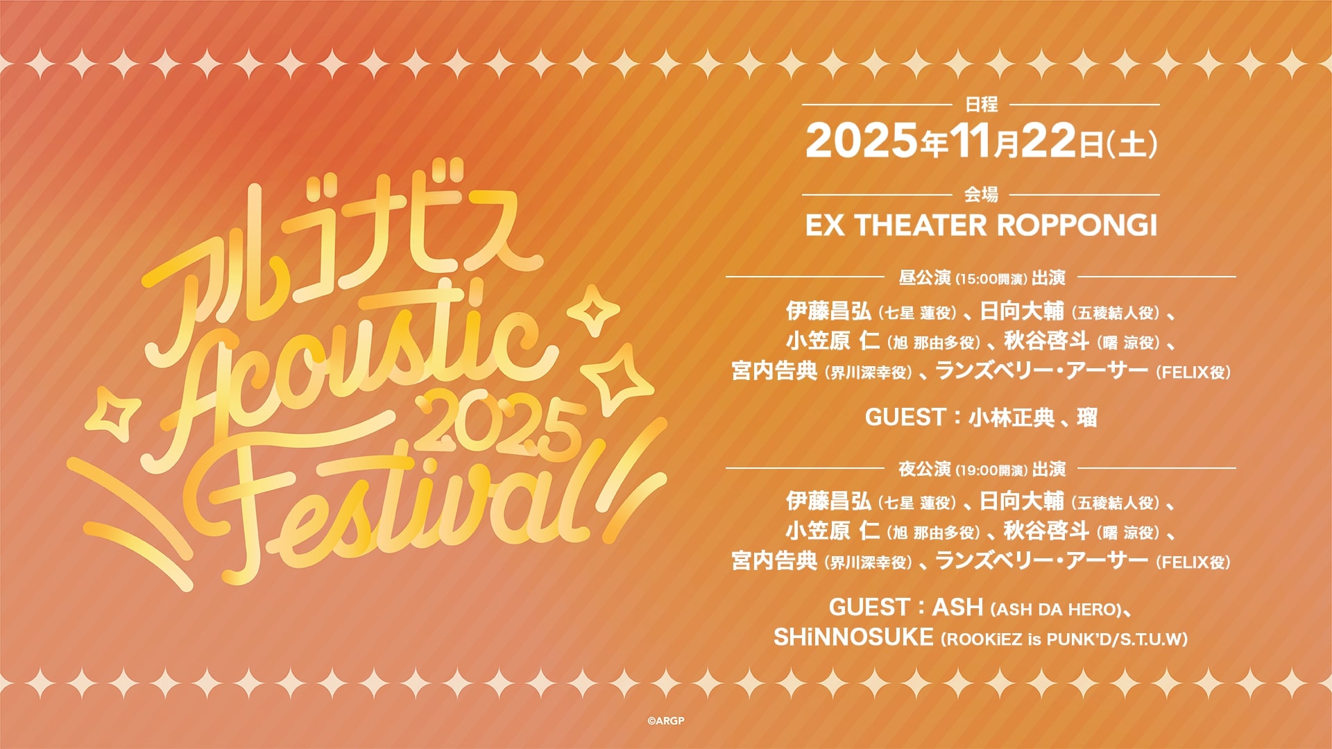 from ARGONAVISプロジェクト恒例のアコースティックライブ、「アコナビス」が2025年11月22日(土)にEX THEATER ROPPONGIで開催。昼・夜、各部ゲストを迎えての盛りだくさんな公演をお見逃しなく!