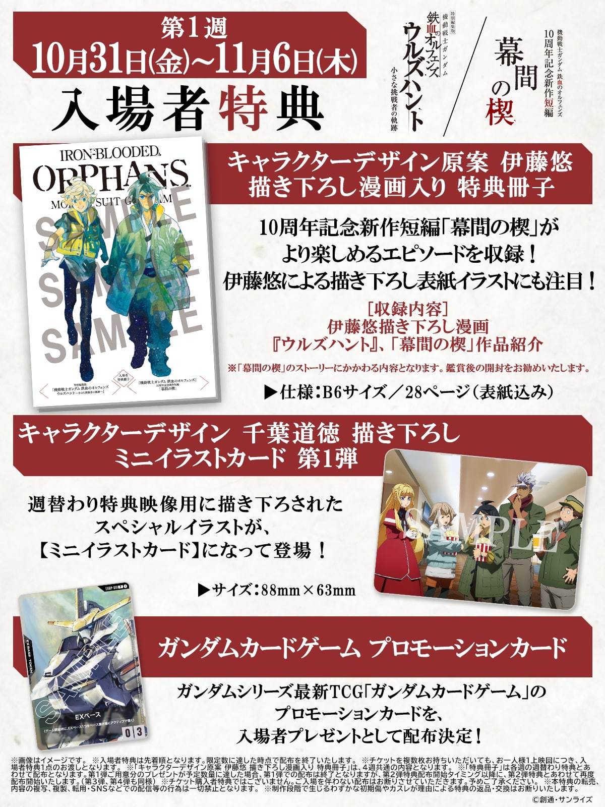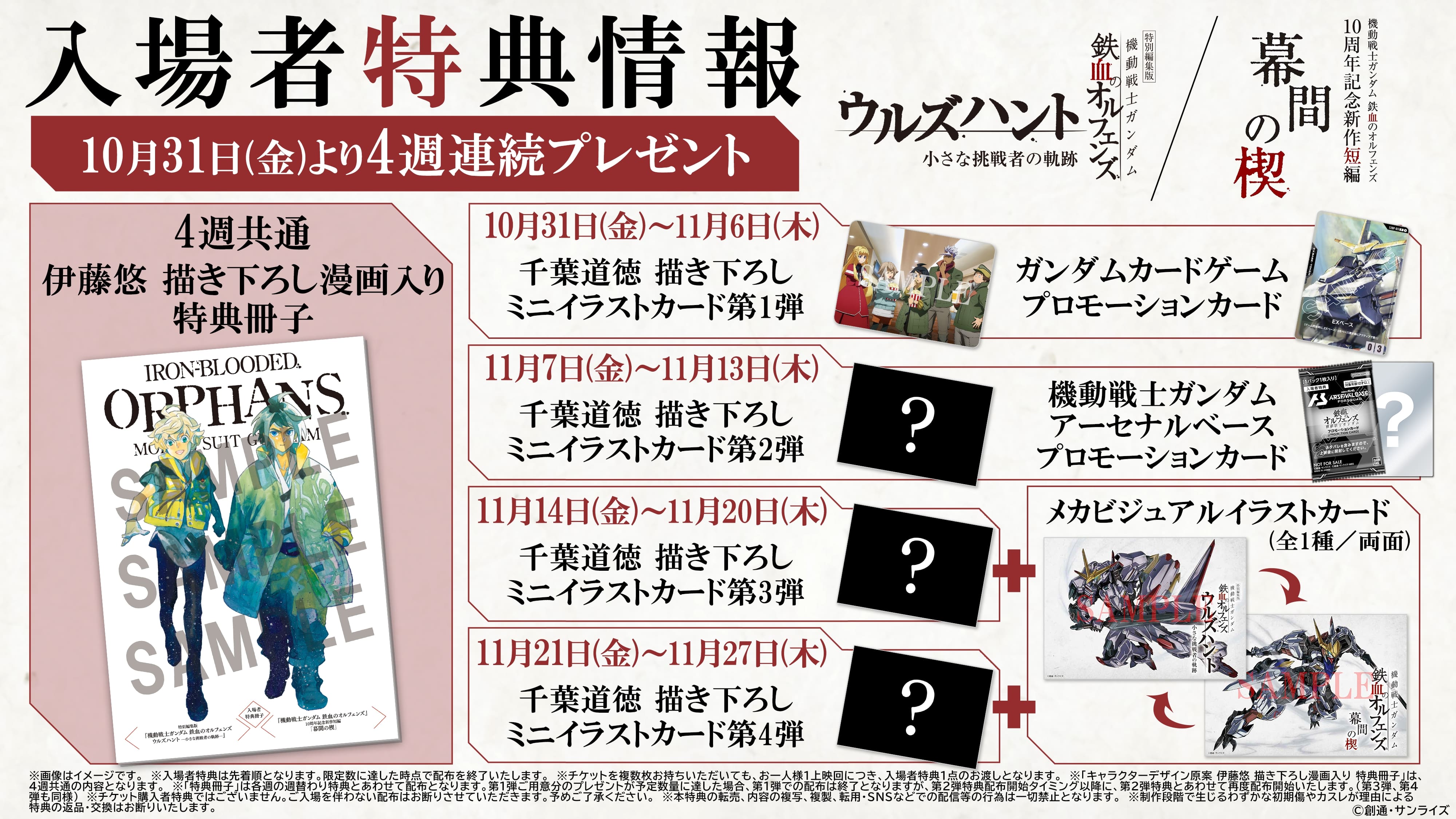 『ウルズハント』と新作短編「の」に登場する各主人公機が躍動する新規描きおろしビジュアルとなっている。また、入場者特典第3弾~第4弾では「端白星&バルバトスアダプト 上映記念ビジュアル」の端白星とバルバトスアダプトを使用した「メカビジュアルイラストカード」の配布も決定した。