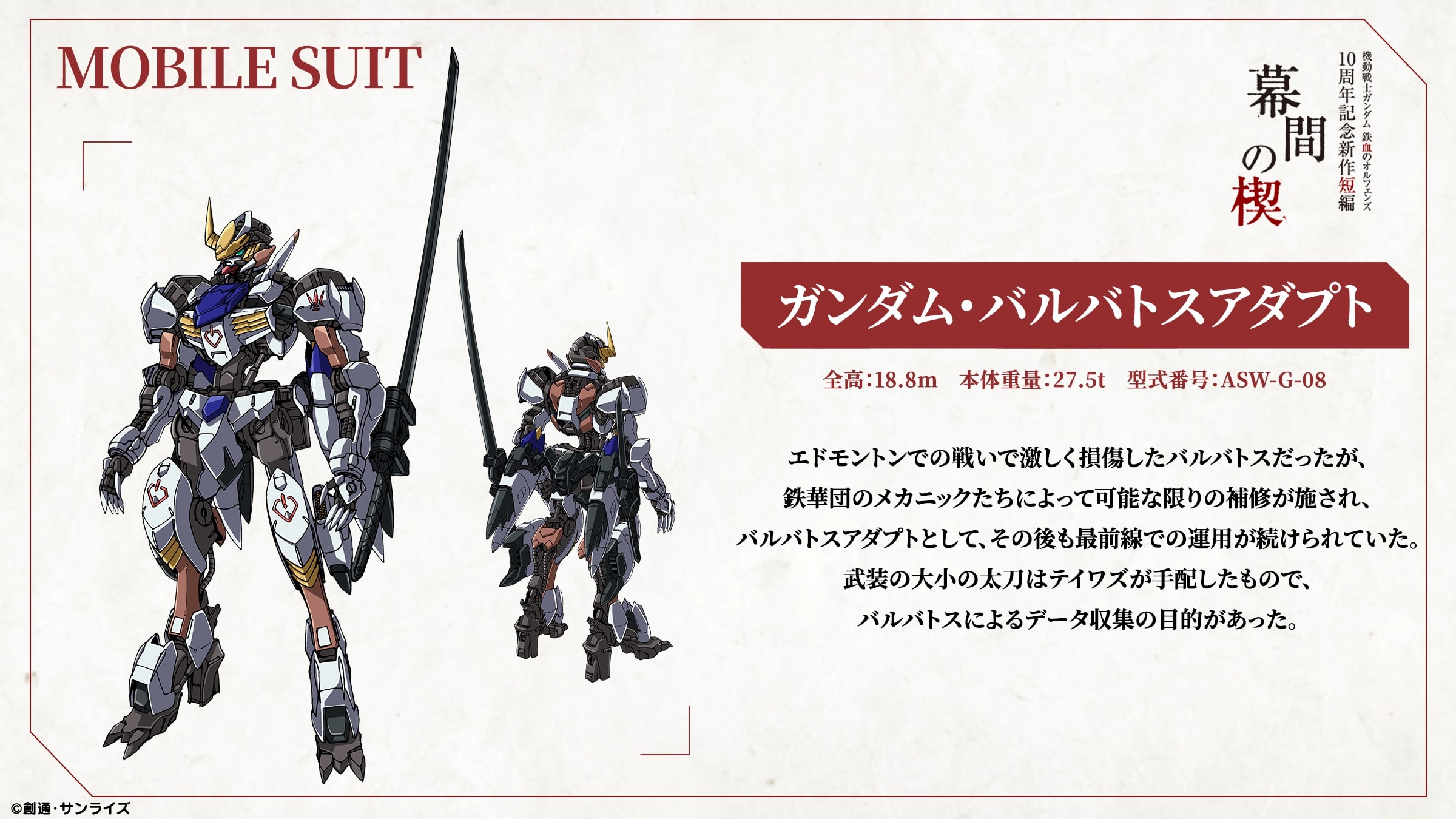 ガンダム・端は白星じろぼしは、メイン武装であるスマートメイスを携えた力強い姿で登場。一方、「幕間まくあいの楔くさび」で初登場となったガンダム・バルバトスアダプトは、太刀を片手に、熱く激しい戦闘シーンを彷彿とさせるビジュアルとなっている。