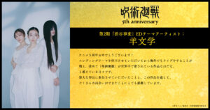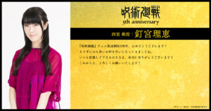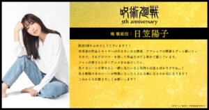 今回、出演キャスト&TVアニメ第2期「渋谷事変」EDアーティストより、アニメ『呪術廻戦』5周年お祝いコメント第4弾が到着した。
