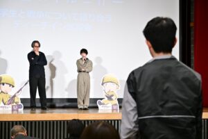 発表終了後、上映を終えて行われたティーチインには、田丸均役の声を務めた板垣李光人と武田一義が登壇。板垣・武田が登場すると、約400人の観客は盛大な拍手の音で迎えた。