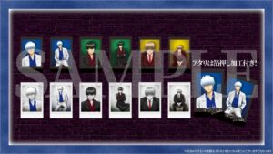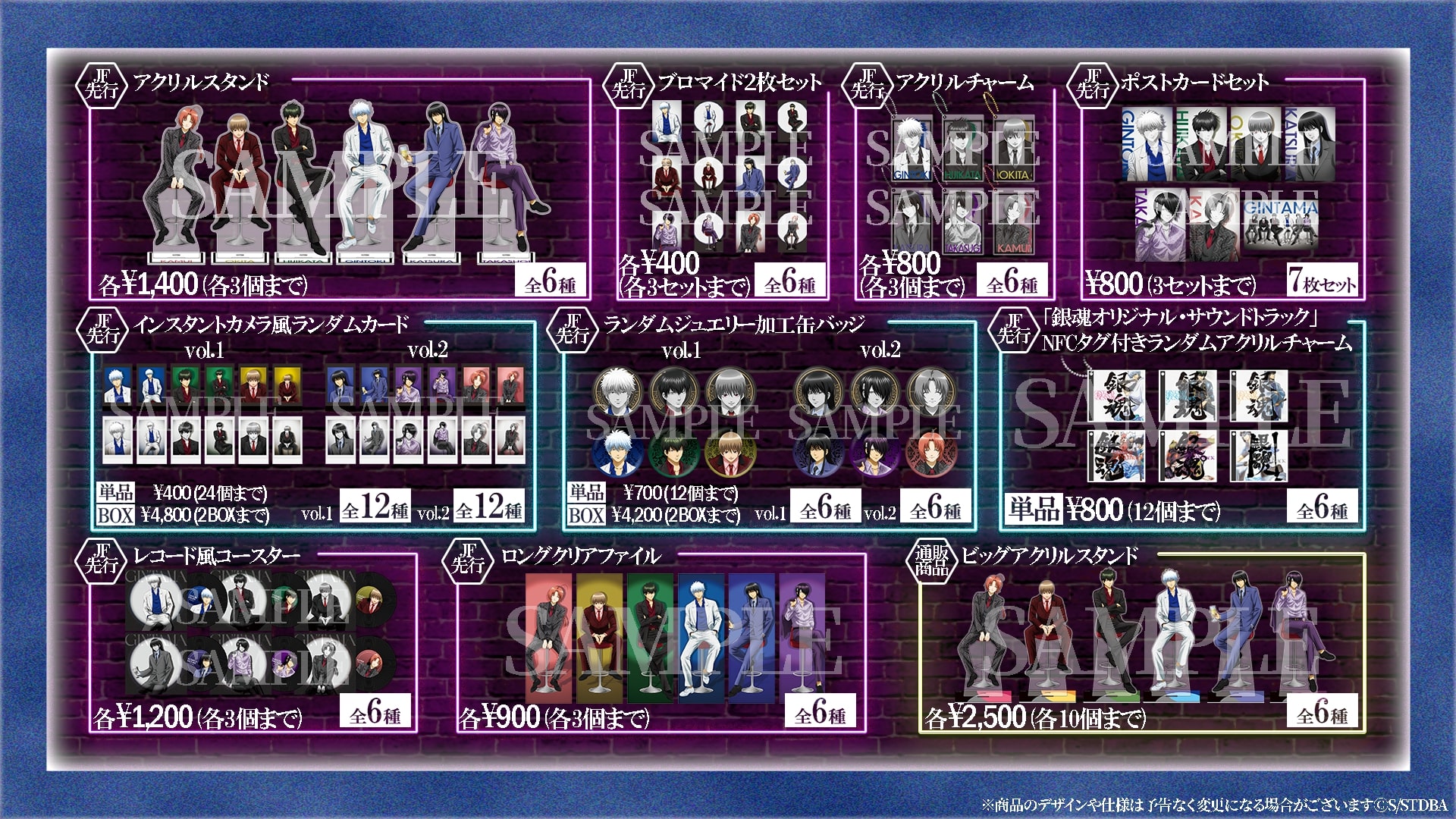 銀時、土方、沖田、桂、高杉、神威の6キャラクターの新規描き下ろしイラストを使用したアクリルスタンドや、ブロマイド2枚セット、スマートフォンをかざすと「銀魂」シリーズの楽曲のストリーミングサービスへのリンクが埋め込まれたNFCキーホルダー等、様々なグッズが販売される。
