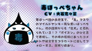 毒ほっぺちゃんは大きなマスクをしている特徴のあるキャラクターです♡収録も出来るだけ毒ほっぺちゃんに寄せるために、マスクをつけて行いました!回を重ねるごとに愛情が湧いてくる…!!そんな毒ほっぺちゃんを楽しみにしていてください!♡