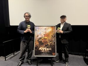 終戦80年記念作品として大きな注目を集める映画『ペリリュー ー楽園のゲルニカー』のティーチイン試写会がT・ジョイ京都にて開催され、原作者であり共同脚本を務めた武田一義と京都精華大学マンガ学部教授の吉村和真が登壇しました。本試写会は「ペリリュー -楽園のゲルニカ-」も展示作品として扱われており今月25日まで開催中の「マンガと戦争展2」を実施している京都国際マンガミュージアムによる提案で開催に至ったもの。試写会前には武田が京都国際マンガミュージアムを訪問し、実際に「マンガと戦争展2」を見学。戦争マンガをテーマごとに4象限で示す体験型の展示に触れ、武田と吉村の議論は弾みます。様々なベクトルを持った多様な「戦争マンガ」が存在している中で、『ペリリュー ー楽園のゲルニカー』が持つメッセージや本作だからこそ成しえる表現技法を語り合いました。