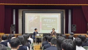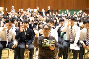 質疑応答では、生徒たちから多くの質問が寄せられた。田丸が戦後に漫画家になれたかという質問には、「原作では戦後の生活から老後まで描かれており、漫画家になっていることが紹介された。数ある戦地の中でペリリュー島を描いたきっかけについては、生還者への取材を続けてきた研究者から話を聞く機会があったことが大きな転機になったと」説明。思い入れのあるキャラクターについては田丸を挙げ、「自身を最も投影した存在」であると語った。また、田丸と吉敷の性格の対比については、当初から二人をセットで主人公と位置づけ、田丸を“見つめる側”、吉敷を“動く側”として物語を構成していたことが紹介された。