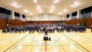 イベントの終盤には、作品を観て抱いた悲しさやつらさをそのまま大事にしながら成長してほしいという武田氏からのメッセージが伝えられた。改めて家族や友人と劇場で観てもらいたいという言葉を添えて、イベントは東部中学校の全校生徒387名の大きな拍手の中で締めくくられました。