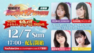 12月7日(日)17時より『戦姫絶笑シンフォギアRADIO』出張版〜サンタもトナカイも絶唱スペシャル〜に「プリンセッション・オーケストラ」より、藤本侑里(識辺かがり/プリンセス・ジール役)、橘 杏咲(一条ながせ/プリンセス・ミーティア役)がゲスト出演が決定!