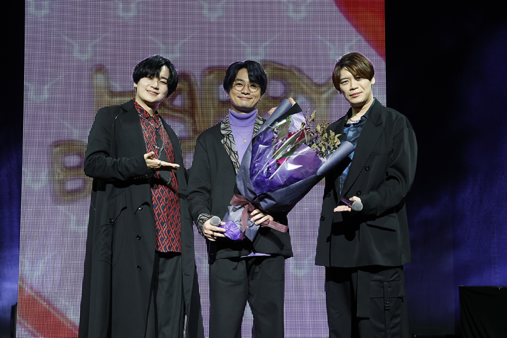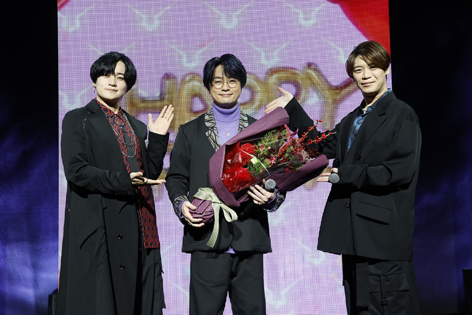 - △【夜公演】は毎年恒例のルルーシュお誕生日のお祝いの 花束を古川慎から手渡した。 写真左から 天﨑滉平、福山潤、古川慎