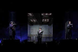 - △【昼公演】は毎年恒例のルルーシュお誕生日のお祝いの 花束を天﨑滉平から手渡した。 写真左から 天﨑滉平、福山潤、古川慎
