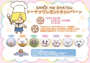 2025年12月19日(金)、20日(土)、21日(日)の期間中、「SANJI no OYATSU」シリーズの商品を一点以上含む、3,000円以上(税込)購入の方にお好きなドーナツを1会計につき1つプレゼント!