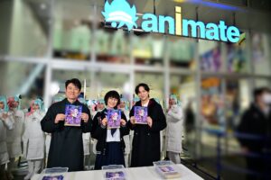 12月15日にはアニメイト池袋本店でゲリラチラシ撒き&トークイベントが実施され、主⼈公・栞の声を務めたSUZUKA(新しい学校のリーダーズ)と、共演の原田泰造、寺西拓人(timelesz)が参加した。