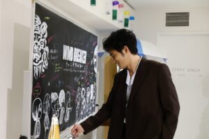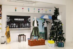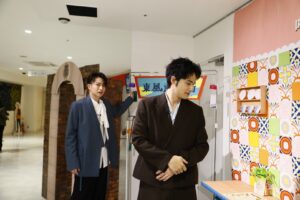 手描きのメッセージボードや、桜の髪型をモチーフにした白と黒のリボンが飾られたクリスマスツリー、さらに商店街の一角を再現した展示まで、細部にまでこだわり抜かれた演出に、二人も「おお、かわいい!」「これ手作りなんだ!」と声を上げて感激。さらに、手描きボードに水上と綱がその場でメッセージを書き込むサプライズも実現し、訪れたファンにとっては見逃せない展示となっている。