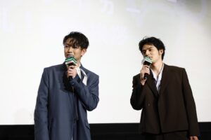 続いて行われた舞台挨拶では、割れんばかりの拍手と歓声に迎えられ、水上恒司と綱啓永がステージに登場。仙台を訪れるのは二人とも今回が2回目だといい、まずは仙台の印象や思い出についてトークが繰り広げられた。水上は「7年くらい前に、映画の撮影で初めて来ました。そのときはちょうど冬で、新幹線で移動している途中に雪が降ってきて、すごくきれいだなと感動したのを覚えています」と、懐かしそうに振り返る。一方の綱は「今年の夏、仕事で初めて来たんですが、そのときに『シーラカンスモナカ』を並んで買って、差し入れしたんです。そうしたら想像以上に喜んでもらえて……仙台のみなさんには感謝しています!」と、仙台名物スイーツの話題で会場をさらに沸かせた。