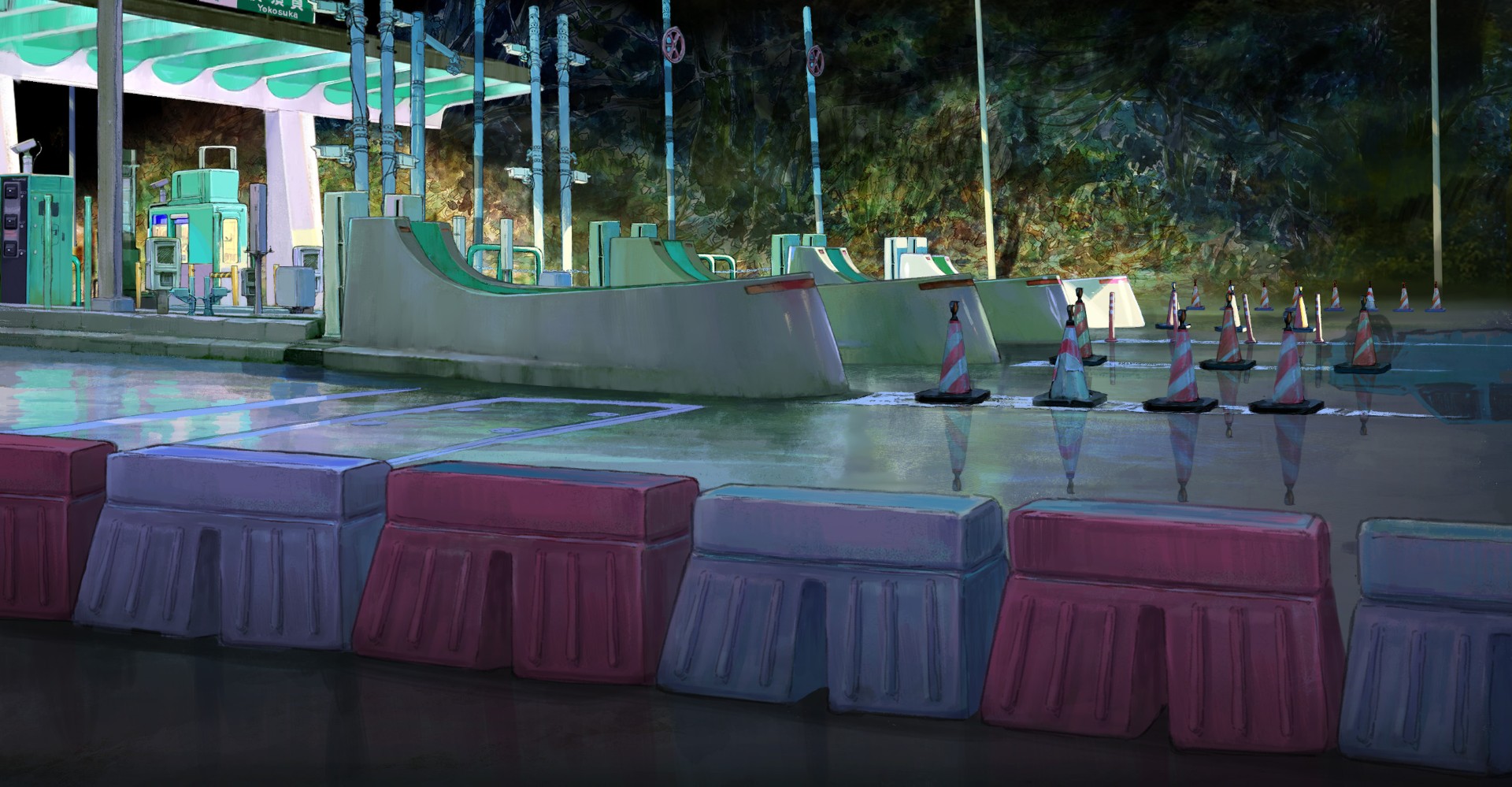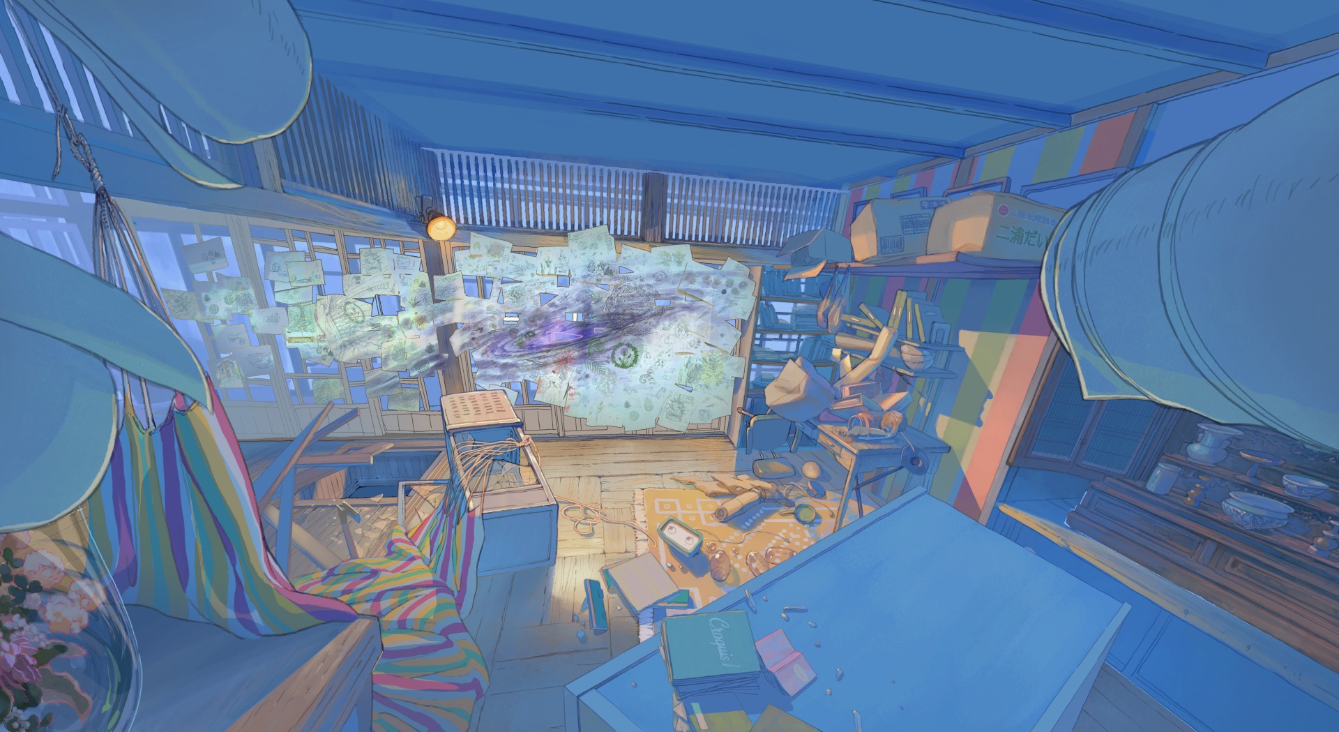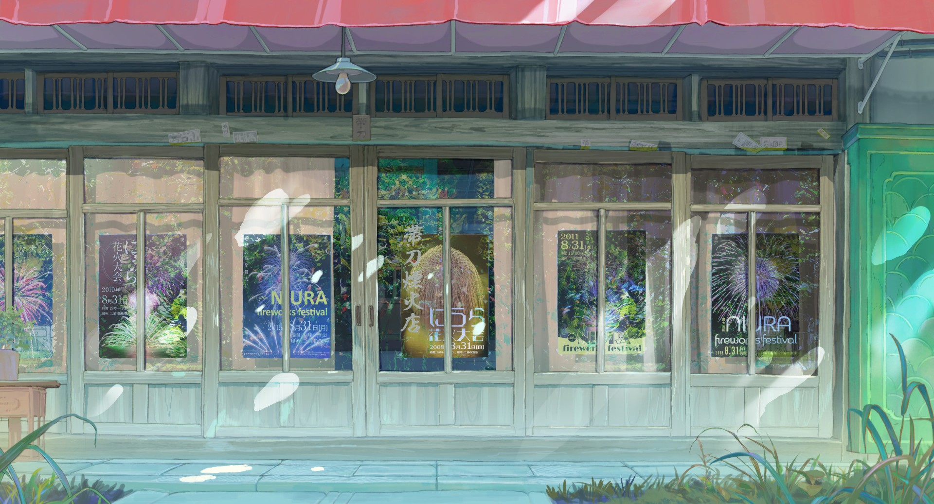 美術ボードには、本作の舞台で敬太郎・カオル・チッチら幼馴染が生まれ育った地元「二浦市」の風景や帯刀煙火店が描かれている。二浦市では町の再開発が進んでおり、美しい入り江だけでなく帯刀家にもその手は迫っている。豊かな緑とむき出しの工事現場が同居する様子は本作の重要なキーポイントだ。