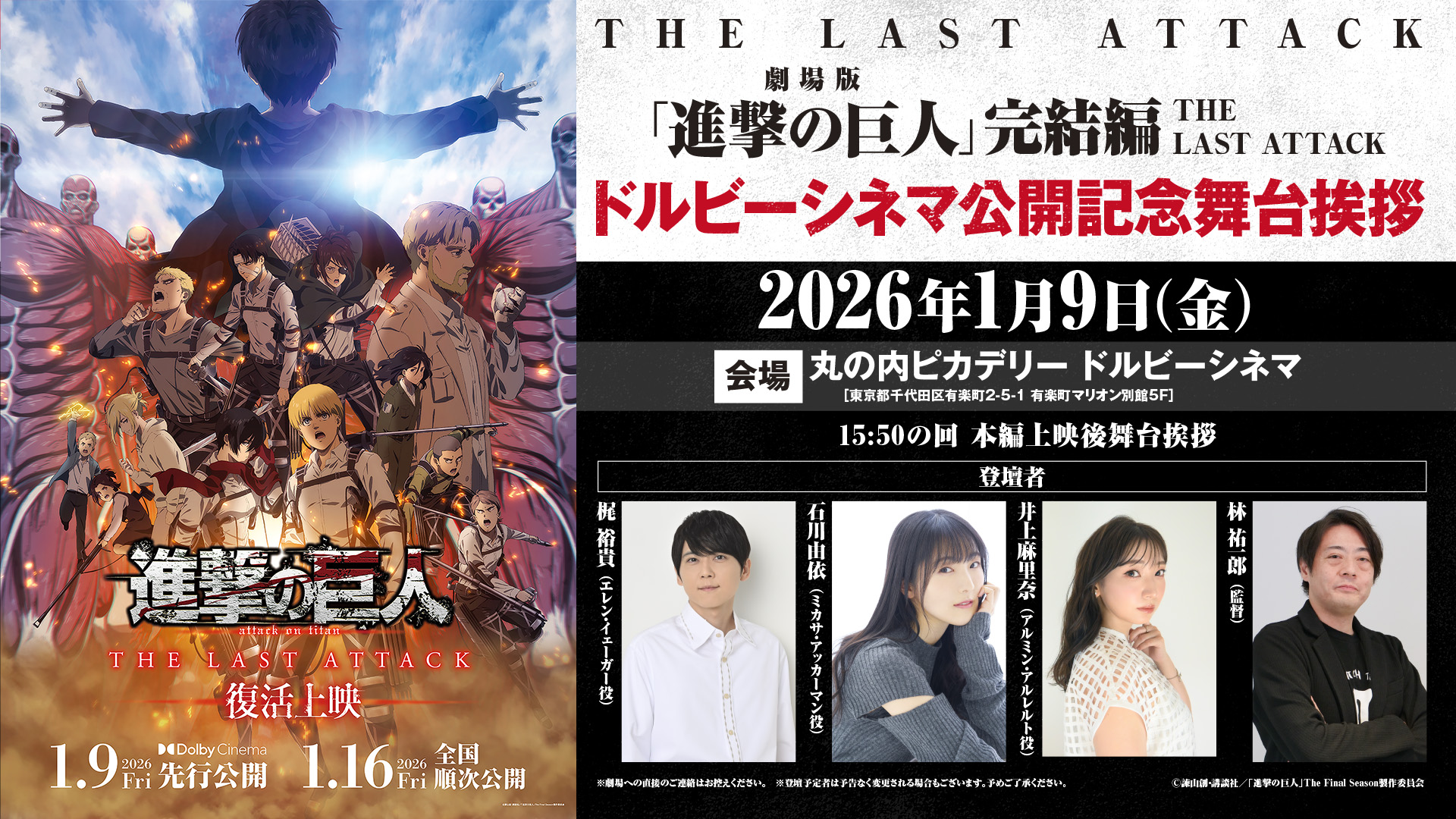 2026年1月9日(金)に本シリーズ初となる、ドルビーシネマ版の先行公開を記念して、初日に舞台挨拶が開催されることが決定した。登壇者は、エレン・イェーガー役の梶裕貴、ミカサ・アッカーマン役の石川由依、アルミン・アルレルト役の井上麻里奈の幼馴染キャストと、監督・林祐一郎となっており、場所は丸の内ピカデリードルビーシネマにて開催。パワーアップして、上映される「進撃の巨人」を堪能し、キャスト&監督トークをぜひ楽しんでほしい。
