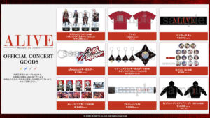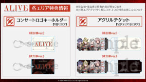 VIPエリアチケットには昼夜各公演それぞれにアクリルチケットとコンサートロゴキーホルダーが、Sエリアチケットには昼夜各公演それぞれにアクリルチケットが付属される。