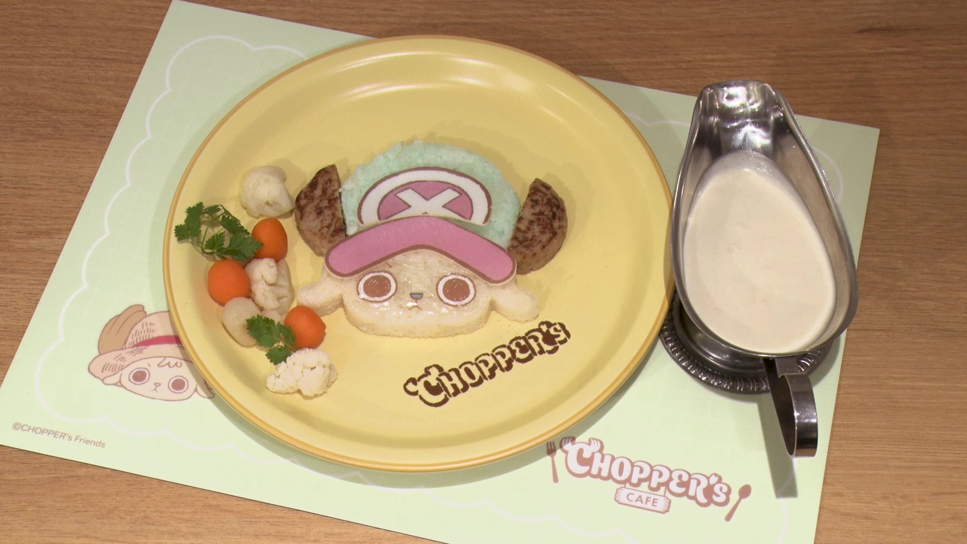 最後に、同日よりオープンする「CHOPPER’s CAFE」の試食会が行われ、コラボレーションメニューの数々がお披露目された。メニューは全部で8種類あり、チョッパーの顔がそのままカレーライスになった可愛らしい「チョッパーのホワイトカレーライス」や、チョッパーの大好物をつめこんだ「チョッパーのごほうびパンケーキ」、わたあめでできた「チョッパーの宝さがしパフェ」などチョッパーの好物をイメージしたスイーツなどが紹介された。