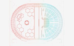 『“One Last Kiss” for EVA EXTRA 30』は、「EVANGELION:30+;」の展示周遊エリア「EVA EXTRA 30」の中央にそびえたつ縦6m×横4mの大型LEDモニター6面をハニカム型に展示され映像体験装置セントラルタワーを軸に構成。