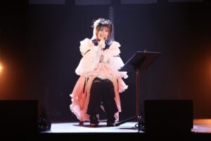 続くアコースティックコーナーでは「Mail Me」、「21世紀」としっとりと歌い上げ、“次は、私が声優として出演している作品のテーマソングを歌いたいと思います“と、テイルズオブジアビスOP、BUMP OF CHICKENのカバー「カルマ」、”今日ね、私の誕生日なんですけど、もう1人誕生日の人が居るんだよね。私のとっても大事な人だニャン“岡部倫太郎の誕生日ということで、シュタインズゲートOPのカバー「スカイクラッドの観測者」で情景豊かに声を響かせる。