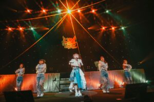 そして、今度はアルバム曲でもインパクトのあるポエトリーラップ「Honey Bee」を披露。ラップ調のパートもある独特の楽曲を見事に表現し、チル感がありつつ目の離せない雰囲気にみんなを引き込んでいく。さらに、「START!IN MY ROOM」(1stシングル「I’m GAME!」カップリング曲)では、とろけるような歌声とゆったりした雰囲気にみんなを包みこむ。ステージの階段に腰掛けて歌うのは、まさに自宅の部屋でまったりする姿を想起させるもので、一緒の空間にいられる喜びが会場に充満するなか歌い上げ、いったんステージをあとにした。