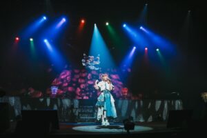 カバーコーナーを終え、1stコンサートもいよいよラストスパートに突入。アーティストデビューからハイペースでリリースしてきたシングル表題曲を連続で披露していった。まずは、アーティスト・立花日菜にとって初バラード曲となった3ndシングル表題曲「Stella」(TVアニメ『Übel Blatt~ユーベルブラット~』ED主題歌)。星空のようなライトが輝き、階段に腰掛けたり胸に手を当てたりしながら、想いたっぷりの歌声を響かせていく。