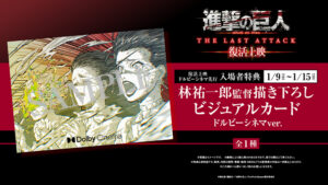 復活上映ドルビーシネマ先行入場者特典は、監督・林祐一郎描き下ろしビジュアルカード ドルビーシネマver.だ。エレン、ミカサ、アルミンの幼馴染3人が、ドルビーシネマを体験し、映像と音の迫力に圧倒されているイラストで、全1種配布となる。