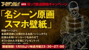 1月5日より毎週月曜23:30にオープンする特設ページより、指定の名言ハッシュタグと、応援&お祝いメッセージをあわせてツイートされた方全員に、お礼の「名シーン原画スマホ壁紙」(各話1種)をプレゼントッ!!