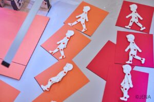 カットアウト人形という紙の人形を使って、グループで協力してアニメーションを作ります。みんなで身体を動かして「動き」の実感を掴み、それを他の人にも伝わるように表現します。紙とモールでカットアウト人形を作ることから始めて、グループの中で分担しながらひとつの動きを作るので、小学3年生以上なら誰もが楽しめるアニメーション作り体験です。