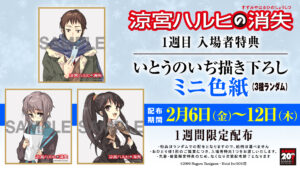 劇場版『涼宮ハルヒの消失』のリバイバル上映の1週目の入場者特典、原作イラスト・いとうのいぢによる描き下ろしイラストを使用した「ミニ色紙」の絵柄が解禁となった。ハルヒ・キョン・長門の各キャラクターをそれぞれ描き下ろしたイラストを使用したミニ色紙(3種ランダム)となっている。 2月6日(金)より全国劇場にて数量限定で配布予定だ。ぜひ映画館に足を運んで、特典を入手してほしい。