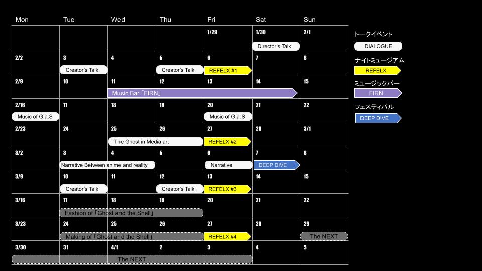 週末ナイトミュージアム「REFLEX of Ghost and the Shell」:全4回(2/6、2/27、3/13、3/27)公開。#2に30周年ロゴを担当したYOSHIROTTENと真鍋大度の共演決定。#3はみんなのきもちによるスペシャルライブセット、#4はMUTEK.JPとのコラボ回決定!(出演者詳細は追って発表)