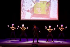 今回のイベントのオープニングアクトを飾ったのは、アニソンシンガーの高取ヒデアキです。BANBANBAN(鮫島一六三、山本クリーニング)率いるベルベ軍団ダンサーとともに、自身が作詞作曲を手掛けた新テーマソング(イメージソング)「ガングリオン~世界征服~」をエネルギッシュにパフォーマンスしました。